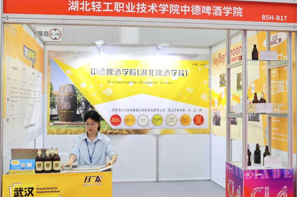 展会现场,湖北轻工职业技术学院中德啤酒学院展位前始终人气鼎盛,众多参展商、行业专家及酒类爱好者驻足观摩、咨询交流。该校在展会中重点呈现了师生近年来在各类竞赛中斩获佳绩的作品及实践教学成果。展位上多款精酿啤酒样品整齐陈列,从经典的中心小麦、IPA款式,到创新研发的果味精酿、威士忌产品,每一款样品标签上都详细标注着原料配比、酿造工艺等核心技术参数,凝聚着师生的专业智慧与实践心血。同时,展区通过图文并茂的展板、内容详实的宣传手册等形式,全面介绍了该校精酿酒师培训班的课程体系。直观展现出该校扎实的教学实训水平,让参观者清晰感受到职业教育与产业实践的深度融合。