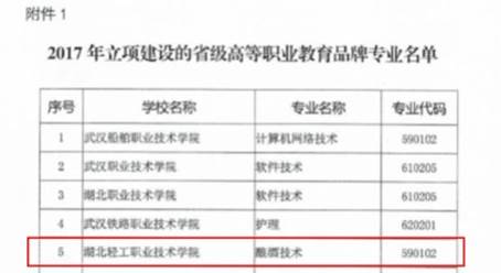 (转载自湖北轻工职业技术学院官网)在刚刚公布的湖北省2017年立项建设的高等职业教育品牌专业与特色专业名单中,我校酿酒技术专业位居10个高等教育省级品牌专业之列!