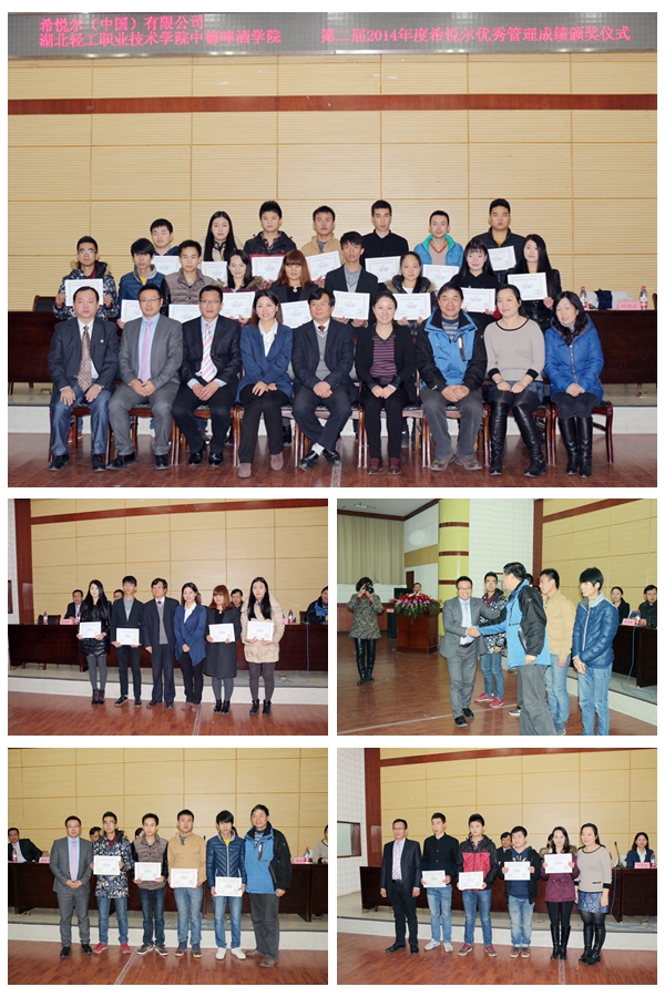 下午二时十五分,第二届希悦尔优秀管理成绩奖颁奖仪式在学术报告厅举行。希悦尔(中国)有限公司大中国地区人力资源总监张蓓女士、市场部经理张黎骏女士、业务发展经理曹粉平先生及招聘主管叶信彦女士、湖北轻工职业技术学院副院长陈向斌先生、中德啤酒学院院长刘少清先生、党总支书记程汉生先生及副院长杜波涛先生出席了颁奖仪式,仪式由中德啤酒学院实训部主任陈敬春先生主持。首先,张蓓总监代表公司致颁奖贺词,向这次获奖的优秀学生干部表示祝贺并鼓励他们再接再厉,希望他们在未来的工作岗位上做出成绩;随后,中德啤酒学院程汉生书记宣读了获奖学生名单。在催人奋进的颁奖进行曲中,希悦尔公司的各位嘉宾和学院的各位领导为获奖学生颁发了证书和奖金。湖北轻工职业技术学院陈向斌副院长代表学院致答谢词,感谢希悦尔公司一直以来对我院教育事业的大力支持、对我院学生干部的亲切关怀,他希望同学们戒骄戒躁、认真学习、踏实做事,不辜负校企双方的殷切期望。