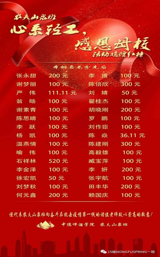 15农夫班的同学们有的还在居家隔离,有的同学已经复工奋斗在工作岗位上,在得知班长张永甜同学发起捐款的第一时间立马将爱心传送过来,甚至有的同学身负房贷和生活的压力仍然要尽一份自己的微薄之力,最终全班能联系上的同学共计捐款4167.22元,由张永甜同学转交给了学校。