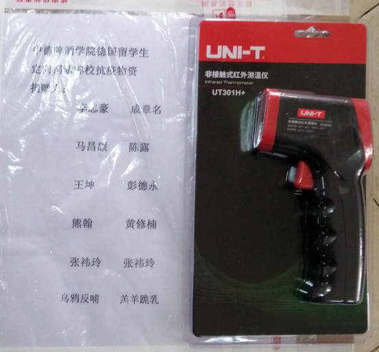 在此次抗疫物资捐赠活动中, 李志豪、成章名、陈露、王坤、彭德永、熊瀚、黄修楠、张祎玲等8名我院优秀的德国留学生代表联合捐献UT301h型红外线测温仪27支,马昌颉捐献75%浓度酒精400瓶。同学们均表示能在危机关头为学校贡献出一份力量是他们的荣幸与责无旁贷的义务,乌鸦反哺、羊羔跪乳,轻工学子无论身处何方,都心系着学校发展,无论在怎样的岗位,都感恩着学校培养。此次捐赠让全校师生倍感温暖,极大鼓舞了学校战胜疫情的斗志。