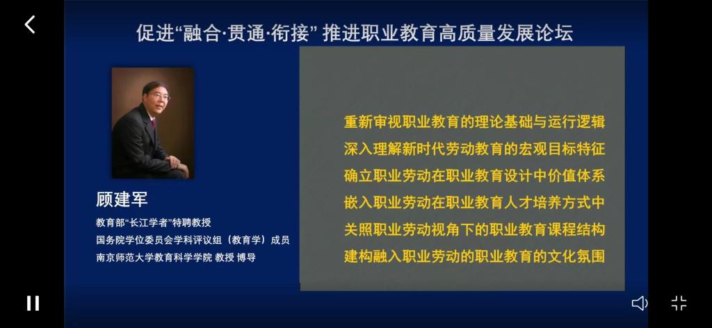本次论坛的主题:促进“ 融合•贯通•衔接”, 推动职业教育高质量发展,办人民满意的职业教育。论坛由武汉城市职业学院副校长叶学文副校长主持,论坛开幕式上,湖北省职业教育学会会长李洪渠、湖北省教育科学院副院长刘国卫、湖北省政协副主席(湖北省中华职教社主任)郭跃进依次做了重要讲话。教育部原副部长、中国职业技术教育学会会长鲁昕做《学法懂法依法,实现职业教育高质量发展》主题演讲,分论坛进行专题交流。交流的三个主要专题是:1.新《中华人民共和国职业教育法》解读;2. 三教改革,产教融合;3. 职教高质量发展。