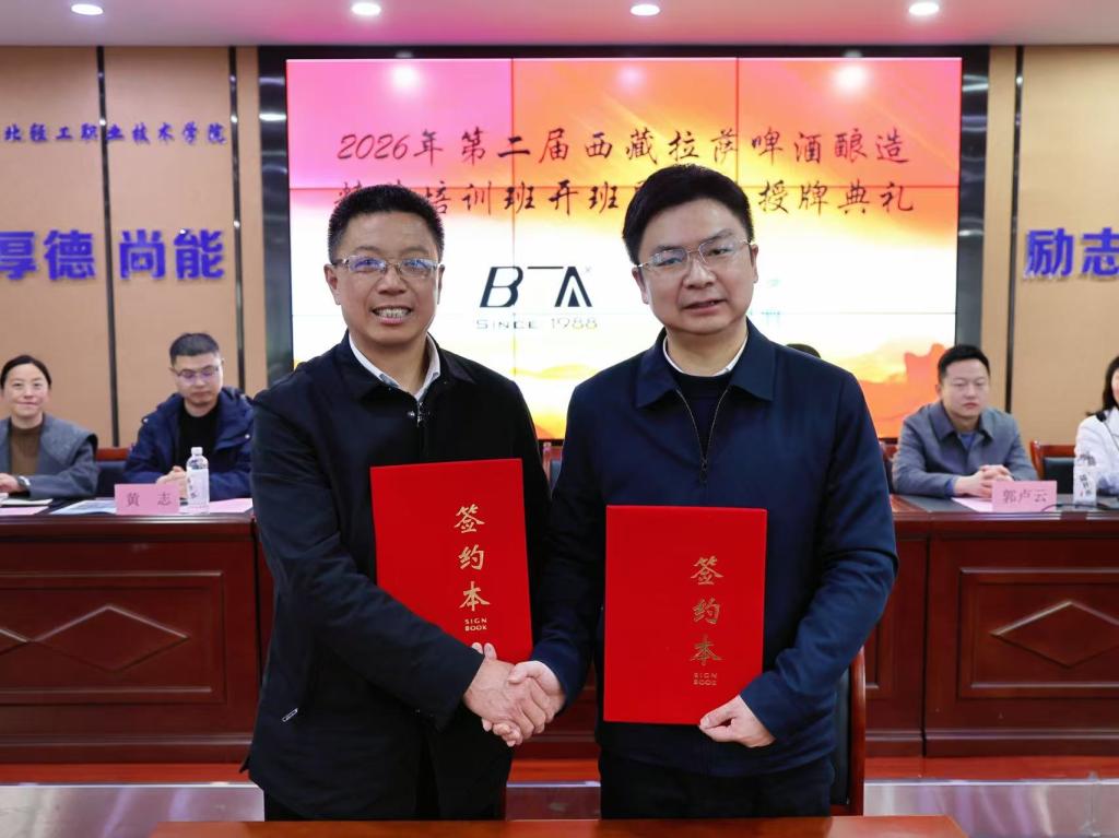 (中德啤酒学院 尹宇 郭卢云讯)2026年3月26日上午,湖北轻工职业技术学院中德啤酒学院与西藏拉萨啤酒有限公司第二期酿造精英培训班开班暨校企合作签约仪式隆重举行,标志着双方的校企合作迈入了更深层次、更广领域的新阶段。西藏拉萨啤酒有限公司总经理蔡明、西藏发展股份有限公司技术经理兼拉萨啤酒研发部经理黄志、西藏拉萨啤酒有限公司质量部主任赵晓清,湖北轻工职业技术学院党委副书记、校长夏光蔚,中德啤酒学院党总支书记、院长刘光成,副院长万莉,党总支副书记郭卢云,培训班全体学员和师生代表共同出席了本次开班仪式。